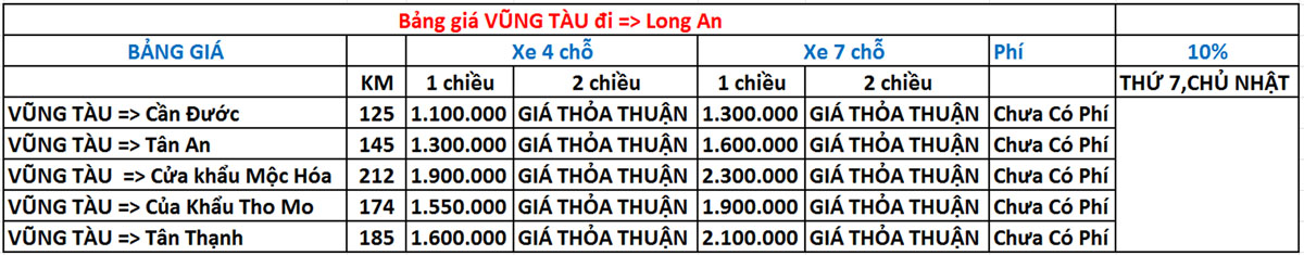 BẢNG GIÁ TP VŨNG TÀU ĐI LONG AN