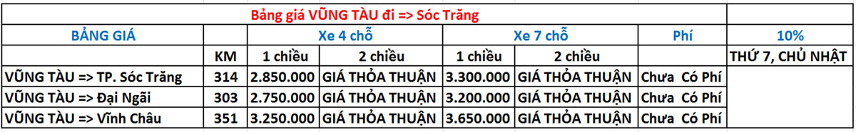 BẢNG GIÁ VŨNG TÀU ĐI SÓC TRĂNG