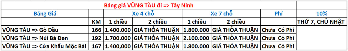 BẢNG GIÁ VŨNG TÀU ĐI TÂY NINH