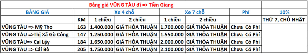 BẢNG GIÁ VŨNG TÀU ĐI TIỀN GIANG