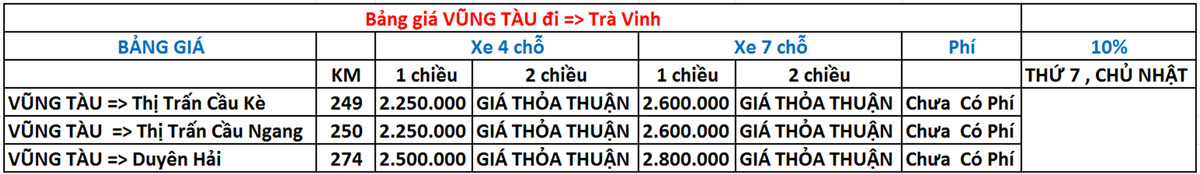 BẢNG GIÁ VŨNG TÀU ĐI TRÀ VINH