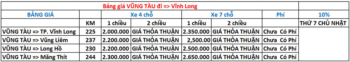 BẢNG GIÁ VŨNG TÀU ĐI VĨNH LONG